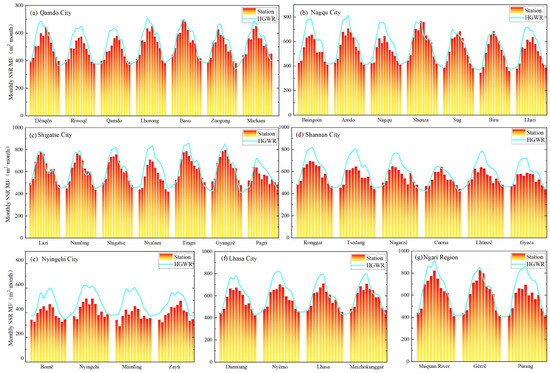 Figure 9 shows the station and HGWR monthly mean SSR of each station during 2006 to 2010. Based on station data, the peaks and valleys of SSR generally occurred in June and December, respectively. While some stations peak in May like Nyalam, Lhünzê, and Zuogong and some in July like Sug, Lhari, Dênqên, Riwoqê, Qamdo, Lhorong, Bomi, Nyingchi, and Mainlin, and even in April like Nagarzê and in March like Pari, the valleys of SSR in Nyingchi City occurred in February and November. From September to October, SSR increased at 17 stations, most of which are located in the eastern region of Xizang. Almost exclusively, the stations in Nagqu and Ngari show a more pronounced single-peak monthly trend. According to Appendix A Figure A1, the annual variation in daily SSR in the eastern, western, and central regions shows that, farther east, the SSR becomes more dispersed. This phenomenon is likely influenced by Xizang’s rainy season. Yu [13] pointed out that water vapor has a strong impact on the monthly value of clear-sky SSR. Xizang experiences distinct wet and dry seasons, with the dry season typically occurring from October to the following April. The rainy season spans from May to September. Starting in May, the westerlies predominantly affect convective activities, primarily on the eastern edge. In June, with the strengthening of the Asian summer monsoon and the southwestern monsoon simultaneously, severe convective activities occur in the southeastern region. From July to August, the southwestern monsoon, rising with the topography, brings ample moisture to the eastern and central regions, while convective activities in the western regions are generally weaker [48]. When the rainy season concludes in October, there is a reduction in atmospheric absorption of solar radiation, resulting in increased radiation. In contrast, the western regions, where convective activities are weaker, continue to exhibit a simple unimodal pattern. The monthly trends in HGWR are mostly in line with those in the station data, and winter is the only time of year when monthly SSR levels may fall below those of station data.