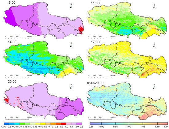 To analyze the intraday variability of solar resources in Xizang, we used HRG’s 3-hour-by-3-hour SSR data to calculate the coefficient of variation (COV) to measure the hourly variability of SSR.