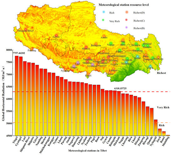Based on the calculated total annual average SSR of the stations, Figure 11 shows the radiation situation in the whole region. Twenty-six stations reached the richest grade, with richest levels (B, C, and D) reaching 3, 7, and 16, respectively. Nine stations are at the very rich level, almost all of them in eastern Xizang. Only three stations in the southeast region are at the rich level.
