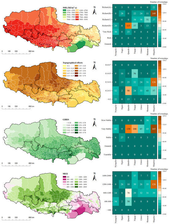 Distribution map of the surface solar radiation (SSR), topographical effects (TE), global horizontal radiation stability (GHRS), and solar resource assessment indicator (SREI) classification on township scale (left). Heat map of the number of townships at classification in seven regions (right).