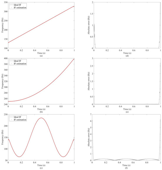 The estimation of the IF using the proposed algorithm for the (a) , (b) , and (c) . The corresponding absolute errors of (d) , (e) , and (f) , respectively.