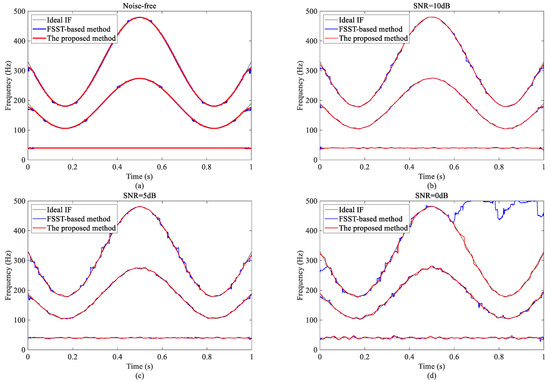 and the sample interval is s. Figure 3a–c represent the results of IF estimations using the proposed method. The corresponding absolute errors between the estimations and the ideal IF are shown in Figure 3d–f, and their mean absolute errors are 0.0276, 0.0364, and 0.2411, respectively. From these three noise-free experiments, we directly draw the conclusion that the estimation error obtained using the proposed approach can almost be controlled under the limit value. Furthermore, it is interesting to examine the effectiveness and robustness of the proposed algorithm under noisy circumstances. Herein, we will compare the obtained result and the ideal one using the mean absolute error. We apply different signal-to-noise ratio (SNR) values ranging from 0 to 20 dB. Figure 4a–c display the results achieved using the two methods. The results show the benefits of taking the fixed-point operator into account. It can be observed that the new method is always lower than the FSST, which means that the new algorithm is more accurate and robust than the FSST-based method.