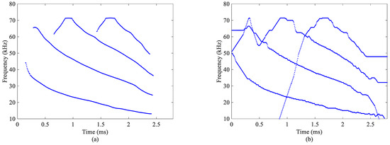 Finally, we consider a bat echolocation call, which is available at Supplementary Materials. Figure 6 shows the estimated IF trajectories based on the proposed algorithm and the FSST. From Figure 6a, it can be seen that the result based on the proposed method gives a better description of IF trajectories. In Figure 6b, the estimated IF trajectories obtained by the FSST partially overlap with each other. Utilizing the IF trajectories estimated using the result of the proposed method, the mono-component modes are decomposed effectively. Figure 7 displays the four decomposed components. Figure 7e lists the summation of the four modes (the red line) and the original bat signal (the black line). The reconstruction errors are shown in Figure 7f. From the result, it can be observed that the reconstruction errors are small, which means that the estimated TF is comparatively accurate.