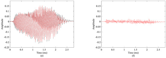The reconstruction of the bat echolocation call. (a–d) The four corresponding modes, (e) the original signal (black) and the reconstructed signal (red), and (f) the error between the reconstructed signal and the original signal.