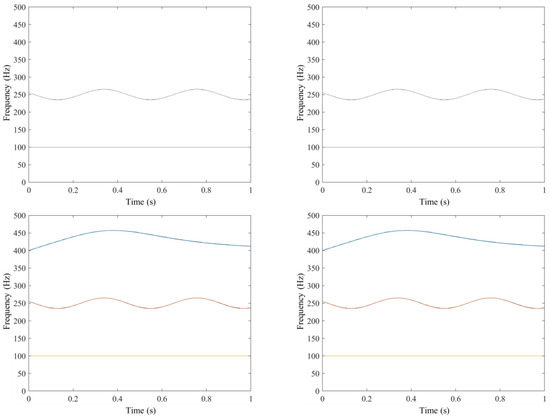 which clearly shows that the IF estimation as soon as , i.e., . Furthermore, the deviation between the IF estimation and the true one is positively related to . Therefore, cannot be regarded as a good estimation of the IF [41]. To achieve a more accurate IF estimation, the operator defined in Equation (9) has been improved [42]. However, when substituting for the variable in Equation (14), we can obtain . That is to say that the IF of is the fixed point of with respect to frequency , which motivates us to use a novel method to represent the IF by combining the fixed-point algorithm with the frequency reassignment operator. Furthermore, the proposed algorithm can mitigate the impact of signal amplitude variations on frequency estimation. Thus, it will also present the IFs of weak components.