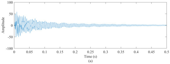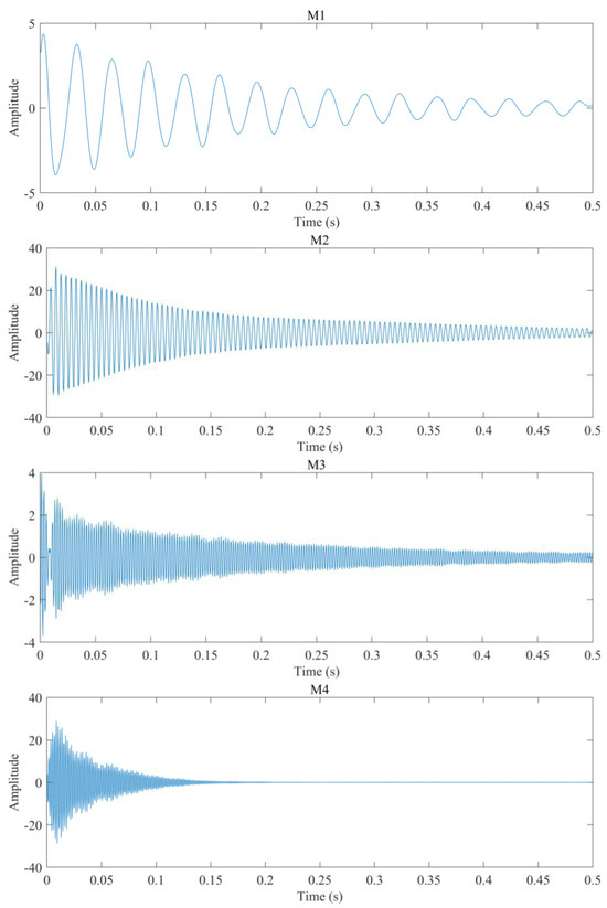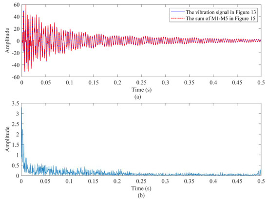 The corresponding results are shown in Figure 10. In Figure 10a–c, the TF features of weak modes are displayed incompletely and are thus not suitable for retrieving all modes to study the corresponding modal parameters. However, from the result obtained using the proposed method, the IF features of each mode are revealed clearly, as shown in Figure 10d. Therefore, we can obtain the TF localizations to reconstruct each mono-component individually. Figure 11 presents modes M1–M5, which can be used to estimate the frequency and damping parameters conveniently. Based on the proposed method, the amplitudes of the reconstructed results are consistent with Figure 9. From Figure 9b, it can be seen that modes M1 and M3 are with weak energies, which are also well retrieved. Based on the absolute errors (Figure 12b) between the vibration signal and the reconstructed signal (Figure 12a), it can be seen that the proposed method retrieves almost all the components within the vibration signal. In fact, in Figure 10d, there are some frequency features that are not revealed in Figure 9b, which may include a desired signal with weak amplitude. This practical example fully demonstrates the potential of the proposed method.
