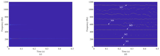The time–frequency analysis (TFA) method can transform a one-dimensional signal into a two-dimensional TF distribution. It is thus considered as one of the most efficient tools to reveal the TF features of nonstationary signals [13]. The short-time FT (STFT), wavelet transform (WT), S transform (ST), and Wigner–Ville distribution (WVD) are typical representative TFA methods [14,15,16,17,18,19]. If a TF representation (TFR) is well matched to the structures of a signal, each component will appear as a “curve” in the time–frequency domain. The curve is composed of a unique sequence of amplitude peaks in the TFR, i.e., ridge points. Based on the characteristics of these curves, we can estimate the corresponding IF [20,21,22,23,24]. Moreover, in addition to noise, it may include possible crossing and self-crossing, i.e., time–frequency overlapping of the signal and noise in the time–frequency plane, which makes it difficult to estimate the IF [8]. Therefore, it is necessary to enhance the quality of the TFR, especially for multi-component signals.