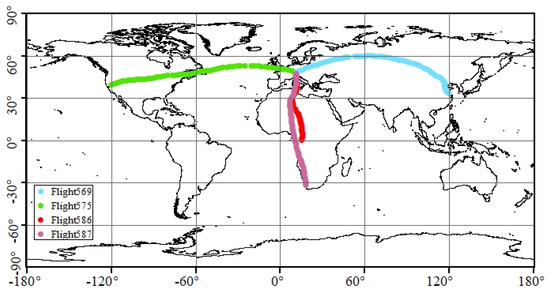 CARIBIC (http://www.caribic-atmospheric.com/, accessed on 28 November 2022) researches and monitors important chemical and physical processes of trace gases and aerosol particles in the upper troposphere and lower stratosphere [11]. Since the CARIBIC program was implemented in 2005, it has typically measured flights once a month for two to four consecutive days with a time resolution of 1 s and a calibration every 25 min. CARIBIC planes flew mostly in the northern hemisphere, with only a small number of flights in the southern hemisphere. In this paper, after May 2019, data from only four flights were available for comparison and validation, and the obtained CARIBIC data were synthesized into time intervals of 10 s and 2 min. The four flights were collected at various locations within a narrow range of altitudes. These flights cover a wide area, and most measurements were made at cruising altitudes of around 9–12 km, such as mid-tropical tropospheric air or mid-high latitude upper tropospheric air and lower tropospheric air. Gas sampling is generally executed at cruising altitude, and most of the CH4 data selected in this part are concentrated in the range of pressure 230 ± 60 hPa. Figure 1 depicts the tracks, dates, and sampling locations of the selected four flights.