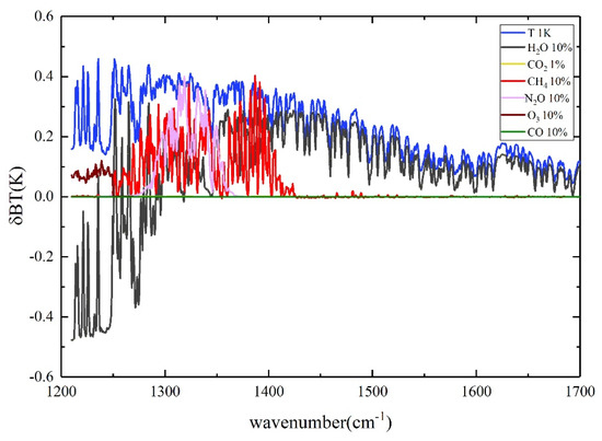 In the thermal infrared spectrum, the CH4 absorption band is located around 7.7 μm. Satellite observations in the spectral band are significantly affected by other atmospheric and surface parameters. In this section, the impact of variations in temperature, humidity profiles and in O3, CO2, CH4, N2O, and other gases on HIRAS radiance is calculated within 1200–1700 cm−1. The temperature and humidity profiles, ozone profiles, carbon dioxide, methane, nitrous oxide, and other gas profiles used in this study are derived from 80 globally representative thermodynamic initial guess retrieval (TIGR) [36] atmospheric profiles. The used data samples cover profile data from different seasons and latitudes. The radiance (or brightness temperature (BT)) is obtained by calculating these profiles in the sample set through the forward fast radiative transfer model, RTTOV. Figure 2 illustrates the average variations in HIRAS BT corresponding with the changes of 10% CH4, 10% CO, 10% N2O, 10% O3, 10% H2O, 1 K T, and 1% CO2. From Figure 2, it can be concluded that the variation in HIRAS BT at the methane absorption band of 7.7 μm (approximately 1299 cm−1) is influenced not only by changes in methane but also by variations in temperature and humidity profiles and N2O. The changes in other gases have minimal impact on HIRAS BT in this spectral region. Therefore, the key issue is how to extract more methane information from these bands while avoiding interference from N2O and temperature/humidity variations.