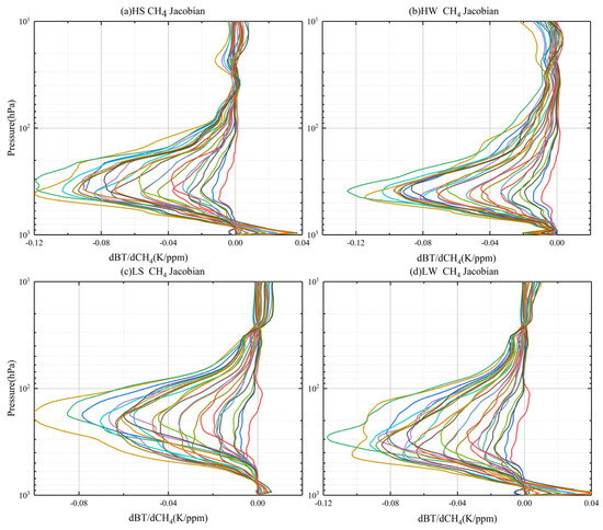 The Jacobian for CH4 was calculated using the 80 globally representative atmospheric profiles from the TIGR database. The selected atmospheric profile samples were from TIGR, The geographical extent ranges from 70°S to 70°N. In the text, these profiles are classified into four categories: high latitude between 90°S–30°S and 30–90°N in autumn and winter (HW), high latitude between 90°S–30°S and 30–90°N in spring and summer (HS), low latitude (30°S–30°N) in autumn and winter (LW), and low latitude (30°S–30°N) in spring and summer (LS). Figure 3 illustrates the average Jacobian of CH4 absorption spectral bands (1210 to 1370 cm−1) calculated by RTTOV for the four scenarios mentioned above. It can be observed that the sensitivity of CH4 peaks occurred in the middle-to-upper troposphere, and that the distribution of CH4 Jacobian matrices varied among the four scenarios. This discrepancy is attributed to significant differences across different regions and seasons of temperature and H2O.