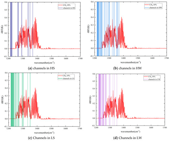 Considering the Jacobian matrix for methane, the impact on simulated satellite radiance and the redundancy information near 7.7 μm, the CH4 retrieval channels were selected which exhibited high sensitivity to CH4 but maintained relative insensitivity to other disturbances. In LS, a set of 36 channels was designated for CH4 profile inversion, where the greatest values of the CH4 Jacobian matrix were observed at the range of 100–200 hPa. In HS, 26 channels were selected for CH4 inversion, and the greatest value of the CH4 Jacobian matrix occurred from 300 to 400 hPa. In LW, 36 channels were selected for CH4 inversion, and the greatest value of the CH4 Jacobian matrix occurred from 300 to 400 hPa. In HW, 34 channels were selected for CH4 inversion, and the greatest value of the CH4 Jacobian matrix occurred from 400 to 500 hPa. Figure 4 shows the retrieved channels in different scenarios near the CH4 absorption bands.