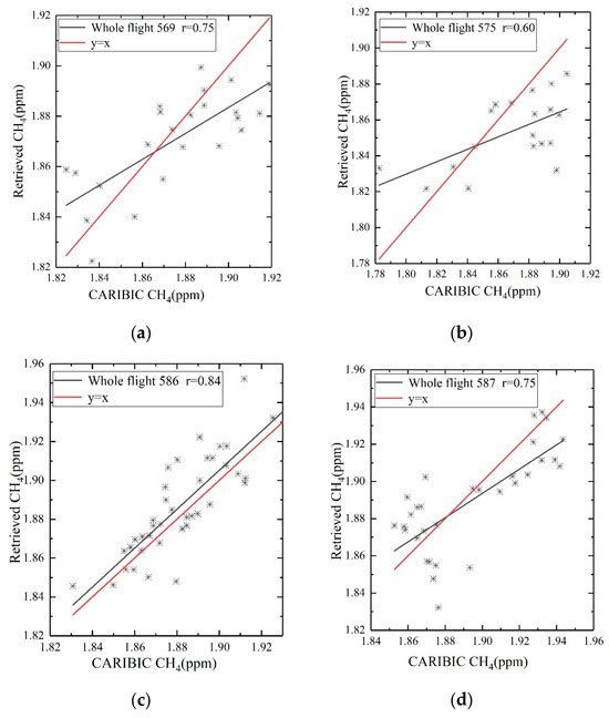 CH4 comparison between HIRAS retrievals and smoothed CARIBIC with a 0.5° × 0.5° spatial resolution. (a) Flight no. 569, (b) flight no. 575, (c) flight no. 586, and (d) flight no. 587.