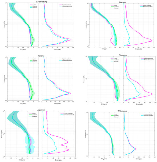 Figure 6 shows the CH4 profiles (a priori, retrieved, and smoothed) and error distribution. The pink solid line, light green solid line, and light blue solid line represent the mean a priori, smoothed, and inverted profiles, respectively, while the shaded areas represent the standard deviation of each item. It can be observed that the CH4 inverted profiles exhibited larger standard deviations between 10–100 hPa compared with 100–1000 hPa, particularly at the St. Petersburg, Toronto, Rikubutsu, Altzomoni, and Wollongong sites. The errors between the a priori and retrieved values, as well as between the retrieved and smoothed values, were larger around 400–500 hPa. However, the errors between the retrieved and smoothed values were smaller compared with the errors between the a priori and smoothed values. Specifically, the errors between the retrieved and smoothed CH4 profiles were <100 ppbv at the St. Petersburg site, <50 ppbv at the Bremen site, <120 ppbv at the Toronto site, <62 ppbv at the Rikubutsu site, <52 ppbv at the Altzomoni site, and <45 ppbv at the Wollongong site.