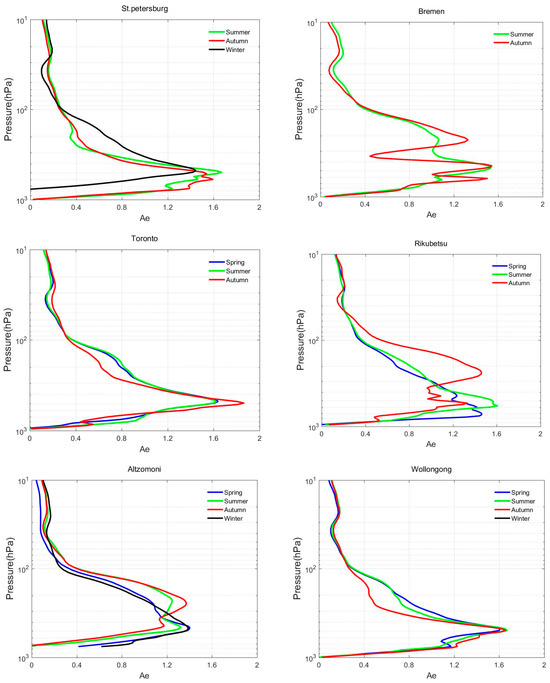 Figure 7 shows the average column Aks (The sum of each AK column is referred to as the “area of AK” or “verticality.”) corresponding with the retrieved CH4 profiles at FTIR sites in different seasons. To calculate the inversion results of AKs for different seasons, sample sizes for each season were only counted if they exceeded five days. It can be observed that the maximum sensitivity often took place during the summer months (e.g., the peaks of Aks for St. Petersburg, Bremen, Rikubetsu, and Wollongong are in summer), while the peak sensitivity for the Toronto and Altzomoni sites occurred in autumn and spring, respectively. It can also be concluded that the majority of the greatest values of the average column averaging kernels exceed 1.5, except for the Altzomoni site, where they were almost all below 1.5. This could be influenced by the latitude and the temperature and humidity profiles, with a greater impact of temperature and humidity resulting in higher peak values of the average column averaging kernels. In the case of mid-latitude regions between 30°N and 60°N, the layer exhibiting peak sensitivity was approximately at 300–400 hPa, while for the low latitudes spanning from 0°N to 30°N, this sensitive layer tended to be at 200–300 hPa. The vertical sensitivity of CH4 inversion exhibited geographical and seasonal variations. Additionally, the distributions of CH4 AKs indicate how the a priori profile affected the inverted profile. The higher sensitivity in the mid-to-upper troposphere indicates that HIRAS can better retrieve CH4 within this range, while the lower sensitivity at the surface suggests that the CH4 profiles at these altitudes from HIRAS primarily rely on a priori information.