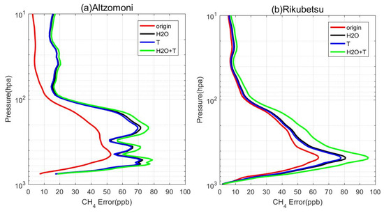Figure 8 illustrates the variations in retrieved CH4 profiles with respect to the smoothed profiles at the Altzomoni and Rikubetsu sites due to changes in temperature and water vapor. The red color (“origin”) represents the error between the methane retrieval results and the smoothed profile when temperature and humidity profiles remain unchanged, while the black color (“H2O”) represents the error when the water vapor profile changes by 5%. The blue color (“T”) indicates the error when the temperature profile changes by 0.2 K from 1000 to 10 hPa and a 2 K difference from 10 to 1 hPa. The green color (“H2O + T”) represents the error when both the water vapor profile changes by 5% and the temperature profile changes as described above. The results show that the error in methane profile changes due to a 5% variation in water vapor profile was slightly higher than the error caused by temperature profile changes at the Altzomoni and Rikubetsu sites. The error in methane profile changes due to simultaneous variations in temperature and humidity profiles (“H2O + T”) was as follows: the maximum error is around 79 ppbv at around 500 hPa, with an average error of 32.2 ppbv and a standard deviation of 43.6 ppbv for the entire profile at Altzomoni site, and the maximum error is around 95.4 ppbv at around 470 hPa, with an average error of 33.3 ppbv and a standard deviation of 27.3 ppbv for the entire profile at Rikubetsu site.