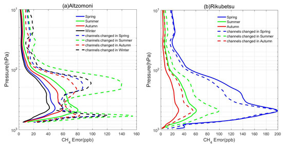 This paper selected different methane retrieval channels based on CH4 Jacobians for different latitudes and seasons, as outlined in Section 3.1. In this subsection, we respectively changed the retrieval channels at Altzomoni and Rikubetsu sites, and then compared the retrieval results with the unchanged channels’ results, described in Section 4.2. The Altzomoni site is located at a low-latitude region, and channels from high-latitude regions were used for Altzomoni retrieval. The retrieval channels at Rikubetsu were exchanged according to the season, with channels from autumn and winter used in spring and summer, and channels from spring and summer used in autumn and winter (as shown in Figure 9). It can be observed that, after changing the inversion channels, the errors between the retrieval results and the observed values from smoothed FTIR measurements significantly increased at Altzomoni. The methane retrieval errors at Altzomoni, without changing the channels, were 19.2, 30.8, 23.3, and 15.9 ppbv for spring, summer, autumn, and winter, respectively. After changing the channels, the methane retrieval errors were 38.2, 54.1, 35.9, and 41 ppbv, respectively. Similarly, the errors between the retrieval results and the observed values from smoothed FTIR measurements also increased significantly at Rikubetsu. The methane retrieval errors at Rikubetsu, without changing the channels, were 73.2, 23, and 12 ppbv for spring, summer, and autumn, respectively. After changing the channels, the methane retrieval errors were 66.2, 34.8, and 19.8 ppbv, respectively. Finally, it is revealed that the retrieval accuracy can be improved by using latitude and seasonal retrieval channels selection.