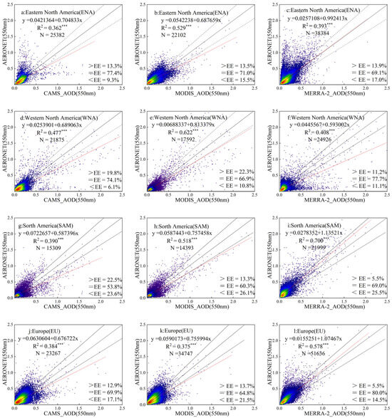 From the spatial pattern of MODIS, CAMS, and MERRA-2 AOD products, it is evident that there are significant differences in AOD among different products. The accuracy of the CAMS, MODIS, and MERRA-2 AODs was assessed against in situ observations using statistical metrics. Generally, within the seven subregions, the three AOD products showed a strong correlation with the AERONET AOD product (Figure 2) but varied in different regions. The highest correlation of the CAMS AOD was observed in SEA (Figure 2p) with an R2 value of 0.500 (p ≤ 0.05). About 66.2% of the product data fall within the EE range, resulting in an overestimation of 14.6% compared to the AERONET AOD. For the MODIS AOD, the highest correlations were found in WNA (Figure 2e) and EAS (Figure 2n) with R2 values of 0.622 (p ≤ 0.05) and 0.624 (p ≤ 0.05). Around 66.9% and 55.4% of the products in these regions meet the acquirement of the EE, leading to overestimations of 22.3% and 16.7% compared to the AERONET AOD observation. The highest correlation of MERRA-2 AOD was observed in SAM (Figure 2i) with an R2 value of 0.700 (p ≤ 0.05). Approximately 69.0% of the product falls within the EE range, resulting in a 5.5% overestimation compared to the AERONET AOD. The MODIS AOD showed a higher correlation with distribution sites in ENA (Figure 2b), WNA (Figure 2e), EAS (Figure 2n), SEA (Figure 2q), and CSWA (Figure 2t) compared to the CAMS and MERRA-2 AODs. The R2 values for these subregions were 0.529 (p ≤ 0.05), 0.622 (p ≤ 0.05), 0.624 (p ≤ 0.05), and 0.570 (p ≤ 0.05); the percentage of the EE ranged from 44.7% to 71.0%. The highest and lowest values were observed in ENA (Figure 2b) and SEA (Figure 2q), resulting in overestimations of 15.5% and 14.3% compared to the AERONET AOD. In SEA (Figure 2q) and CSWA (Figure 2t), the MODIS AOD was underestimated by 41.0% and 41.8% compared to the AERONET AOD, indicating a significant underestimation. The MERRA-2 AOD demonstrated higher correlations with distribution sites in SAM (Figure 2i) and EU (Figure 2l) compared to the CAMS and MODIS AODs. The R2 values for these regions were 0.700 (p ≤ 0.05) and 0.578 (p ≤ 0.05). The products’ percentages of the EE were 69.0% and 80.0% for SAM (Figure 2i) and EU (Figure 2l), respectively, resulting in overestimations of 5.5% compared to the AERONET AOD. In terms of the CAMS and MODIS AODs, the R2 values in EU (Figure 2j,k) and SEA (Figure 2p,q) were similar, with values of 0.384 (p ≤ 0.05), 0.375 (p ≤ 0.05), 0.500 (p ≤ 0.05), and 0.514 (p ≤ 0.05), where the percentage of the EE ranged from 44.7% to 69.9%, and overestimations of 12.9%, 13.7%, 14.6%, and 14.3% compared to the AERONET AOD. Additionally, the correlation differences among the three remote sensing datasets in SEA (Figure 2p,q,r) were relatively small, with an average value of 0.501 (p ≤ 0.05).