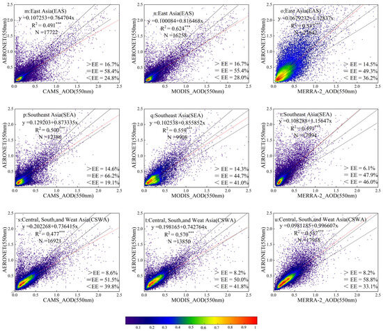 Figure 2. Validation of AOD products against AERONET observation in the subregions. CAMS AOD vs. AERONET in subregions ENA (a), WNA (d), SAM (g), EU (j), EAS (m), SEA (p), and CSWA (s). MODIS AOD vs. AERONET in subregions ENA (b), WNA (e), SAM (h), EU (k), EAS (n), SEA (q), and CSWA (t). MERRA-2 AOD vs. AERONET in subregions ENA (c), WNA (f), SAM (i), EU (l), EAS (o), SEA (r), and CSWA (u). The color bars indicate the frequency of match. *** represents p ≤ 0.01.