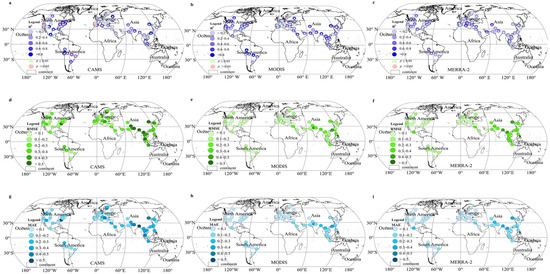 It is evident that there are more sites with an R2 value greater than 0.6 in the CAMS AOD (Figure 3a) compared to MODIS (Figure 3b) and MERRA-2 (Figure 3c). Sites with an R2 value above 0.6 for the CAMS AOD were mainly distributed in North America, South America, and Europe. Sites with an R2 value above 0.6 for the MODIS AOD were primarily found in Asia, while sites with an R2 value above 0.6 for the MERRA-2 AOD were mainly concentrated in Europe. The RMSE values for the MODIS (Figure 3e) and MERRA-2 AODs (Figure 3f) were lower than those for CAMS (Figure 3d). The high RMSE value from the CAMS AOD was widely distributed in North America, Europe, and Asia, with particularly high values in the Asian region. The RMSEs for the MODIS and MERRA-2 AODs were similar and exhibited similar spatial distributions, with a low RMSE at some sites in Asia. The spatial patterns of the MAE value for the MODIS (Figure 3g) and MERRA-2 (Figure 3h) sites were consistent, with high MAE values found in Asia. There are only two sites with an MAE greater than 0.4. The MAE of the CAMS AOD (Figure 3i) was higher than the other two datasets.