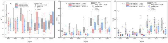 Figure 4. Box plots of R2, RMSE, and MAE for the three AOD products in the subregions. (a) R2 of CAMS, MODIS, and MERRA-2. (b) RMSE of CAMS, MODIS, and MERRA-2. (c) MAE of CAMS, MODIS, and MERRA-2.