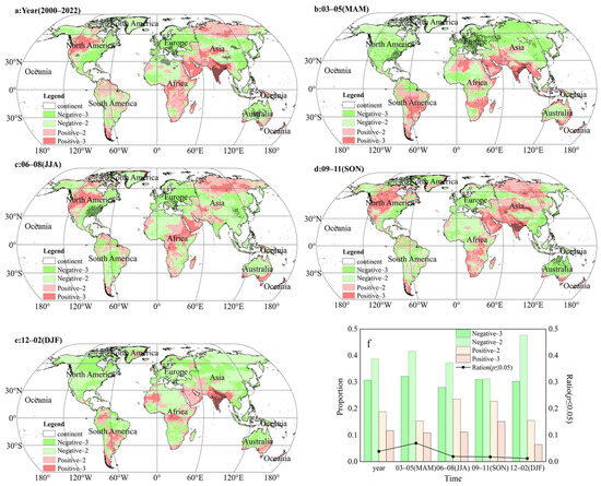 Figure 6. Consistent spatial distribution map of the variation trend. (a): Consistent spatial distribution map of the annual variation trend. (be): Spatial distribution maps of the seasonal variation trend. (f): Statistical chart of consistent variation trends for both annual and seasonal variations. The black dots indicate the 95% confidence of correlation coefficient (p ≤ 0.05).
