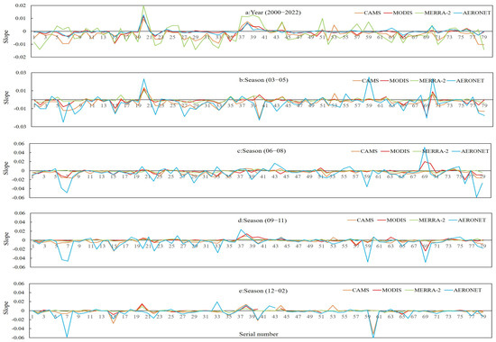 In the annual slope comparison between products and in situ observation (Figure 7a), there was a higher agreement between the CAMS, MODIS, and AERONET AODs than MERRA-2 in terms of matching positive (slope > 0) and negative (slope < 0) slopes. The order of best matches with the AERONET AOD was as follows: MODIS > CAMS > MERRA-2. At the seasonal scale, in MAM (Figure 7b) and SON (Figure 7d), there was a higher agreement between the remote sensing AOD product and the AERONET AOD than the other two AOD products, except for a few stations where the calculated slope values differed significantly. For example, in JJA (Figure 7c) and DJF (Figure 7e), stations 33 and 43 displayed significant differences between the AERONET AOD and the satellite AOD product. Nonetheless, the consistency in the AERONET AOD was relatively high across the other stations. Additionally, the CAMS reanalysis data, which combined both AERONET and MODIS AODs, demonstrated a higher agreement with the AERONET AOD compared to the MERRA-2 AOD.
