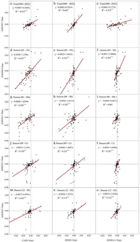 Figure 8. Comparison of AOD trends between AOD products (CAMS, MODIS, and MERRA-2) and in situ observations at different temporal scales. Annual scale trends are depicted in (a) for CAMS AOD trend vs. AERONET, (b) for MODIS AOD trend vs. AERONET, and (c) for MERRA-2 AOD trend vs. AERONET. Seasonal trends in MAM are presented in (d) for CAMS AOD trend vs. AERONET, (e) for MODIS AOD trend vs. AERONET, and (f) for MERRA-2 AOD trend vs. AERONET. Seasonal trends in JJA are illustrated in (g) for CAMS AOD trend vs. AERONET, (h) for MODIS AOD trend vs. AERONET, and (i) for MERRA-2 AOD trend vs. AERONET. Seasonal trends in SON are illustrated in (j) for CAMS AOD trend vs. AERONET, (k) for MODIS AOD trend vs. AERONET and (l) for MERRA-2 AOD trend vs. AERONET. Seasonal trends in DJF are illustrated in (m) for CAMS AOD trend vs. AERONET, (n) for MODIS AOD trend vs AERONET and (o) MERRA-2 AOD trend vs. AERONET. *** represents p ≤ 0.01, ** represents p ≤ 0.05.