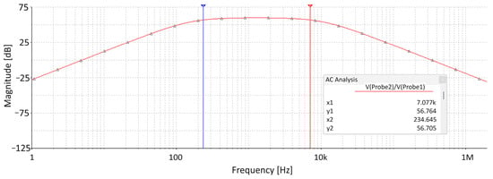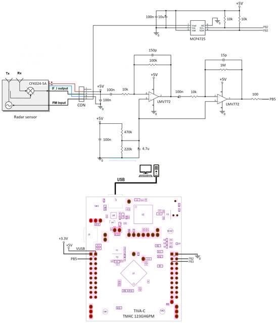 The first proposed implementation of the imaging system takes the form of a Ground-Based Synthetic Aperture Radar (GB-SAR). The low-cost Frequency-Modulated Continuous Wave (FMCW) radar circuit has the schematic presented in Figure 1. For the RF section, the low-cost K-band FMCW radar sensor CFK024-5A from Fevas, China was used. The linear ramp 0–2 V signal needed for modulating the transmitted frequency of the radar in order to generate a linear chirp is created by means of the Microchip Technology MCP4725 Digital to Analogue Converter. The output of the radar sensor is amplified, shifted and filtered by the Texas Instruments LMV772 Operational Amplifier. The digital section of the proposed system is implemented by the Texas Instruments TIVA-C TM4C-123GH6PM development board. The sampling rate used for digitizing the signal obtained at the output of the amplifier is 20,580 Hz with 12 bits of resolution. The frequency domain behavior of the amplifier is shown in Figure 2.