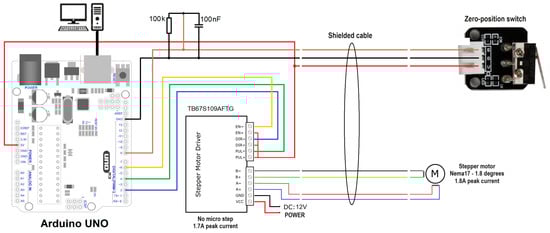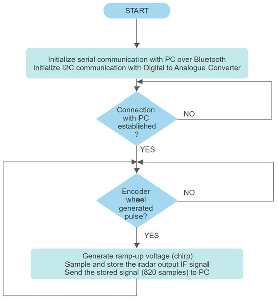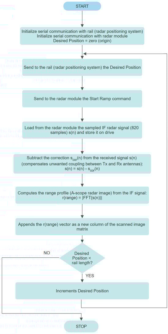 In order to move the radar module in a straight line during the scanning procedure, a computer-controlled rail system was implemented. It will be named the radar positioning system. The rail uses an Arduino Uno board that continuously listens for positions expressed in millimeters sent from the computer through a USB connection, the same computer the radar module is connected to. When a position followed by a New Line ASCII character is received, the Arduino computes the number of steps needed by the stepper motor to move the carriage to the received position and sends the appropriate signal sequence to the Stepper Motor Driver. In order to calibrate the zero position of the rail at the beginning of the scanning procedure, a switch is placed at the start of the rail. The schematic diagram of the rail electronics is presented in Figure 3. The practical implementation of the rail is depicted in Figure 4. The program running on the Texas Instruments TIVA-C TM4C-123GH6PM development board, the digital section of the radar module, implements the flowchart detailed in Figure 5. The program running on the PC implements the flowchart presented in Figure 6. The scor(n) correction signal is the radar output IF signal obtained in a reflection-free environment, the anechoic chamber. Range argument in r(range) is the discrete range or distance vector. FFT designates the Fast Fourier Transform.