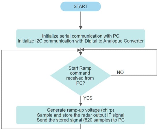 The program running on the TIVA-C TM4C-123GH6PM development board, the digital section of the radar module, implements the flowchart in Figure 9. The program running on the PC implements the flowchart presented in Figure 10. The scor(n) correction signal is the radar output IF signal obtained in a reflection-free environment, the anechoic chamber. Range argument in r(range) is the discrete range or distance vector. FFT designates the Fast Fourier Transform.
