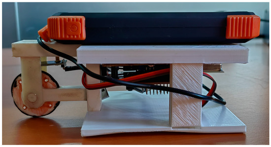 The second proposed implementation of the imaging system takes the form of a hand-held Ground-Penetrating Radar (GPR). It builds upon the hardware of the GB-SAR implementation by adding a Bluetooth module for wireless connection with the PC, an encoder wheel and optocoupler for determining the radar position and a battery (powerbank). The new radar circuit has the schematic presented in Figure 7. The encoder wheel has a diameter of 3.82 cm and 4 equally spaced holes, which gives 4 pulses at the output of the U-shaped optocoupler for every revolution. This means a pulse for every 3 cm traveled by the GPR. Every pulse triggers a scan producing an A-scope image, so that the azimuth sampling step of the radar image is 3 cm. The practical implementation of the GPR system is presented in Figure 8.