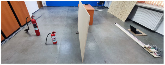 The system was tested using the setup described in Figure 12. Two cylindrical metal targets represented by two fire extinguishers were placed behind a 3 cm-thick MDF (medium-density fiberboard) wall.