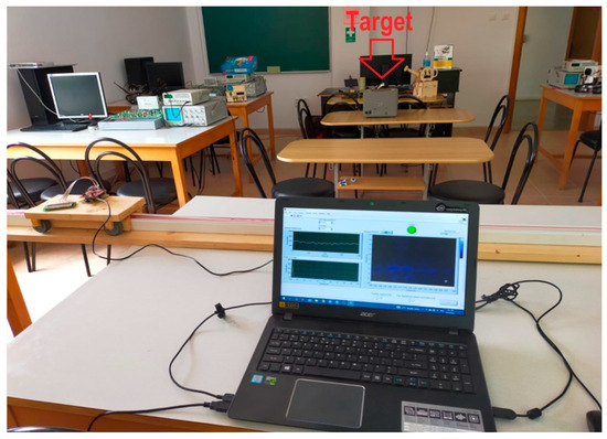 The GB-SAR implementation performance was tested in two experiments. The first one was designed to test the imaging ability of the system by placing two metal fire extinguishers behind an MDF wall. The raw image was focused by means of the proposed SAR algorithm, and the targets’ positions in the radar image were confronted with real-world tape measurements. The second experiment was designed to test the interferometric capability of the GB-SAR implementation by determining the movement of the metal case target placed in front of the system between two successive scans.