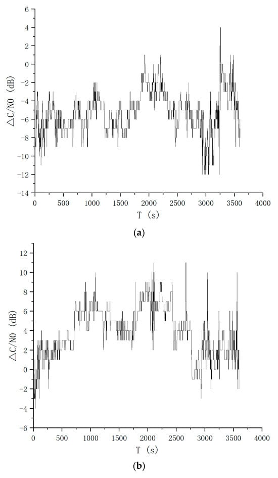 Figure 3. Pseudo-satellite C/N0 spatial variability test. (a) Channel 1 pseudo-satellite signal C/N0 spatial variability test. (b) Channel 2 pseudo-satellite signal C/N0 spatial variability test.
