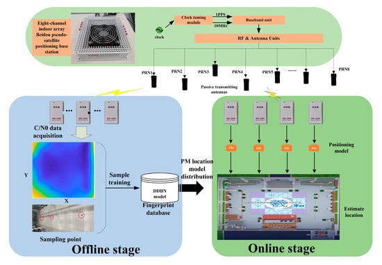 - Online stage. In the current indoor non-line-of-sight environment, the user terminal receives the eight-channel pseudo-satellite RF signal in real time and estimates the real-time position of the user terminal using the positioning model.
