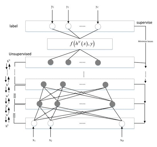 After greedy unsupervised training, is an abstract representation of . Then, based on labeled data, the parameter space is optimized by the supervised learning method using the gradient descent method: