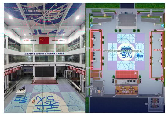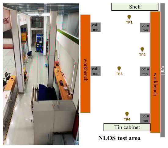 The test area was located at the artificial intelligence navigation test site of the State Key Laboratory of Satellite Navigation System and Equipment Technology. The test site was a three-story building with a steel structure. The indoor array pseudo-satellite antenna was deployed at the top of the test site, utilizing a double-circle array network. The first floor of the test site included the central line-of-sight test area and the non-line-of-sight (NLOS) test area on both sides. The second and third floors of the test area consisted of circular corridor structures. The test environment was situated in the signal NLOS area on both sides of the first floor, and the left NLOS signal area was selected as the test area for this experiment. The total area measured 48 m², with dimensions of 12 m in length and 4 m in width. The test environment comprised a wooden workbench, concrete columns, tin cabinets, iron shelves, concrete walls, and a smooth ceramic tile floor. The internal structure and test scene of the test site are illustrated in Figure 6.