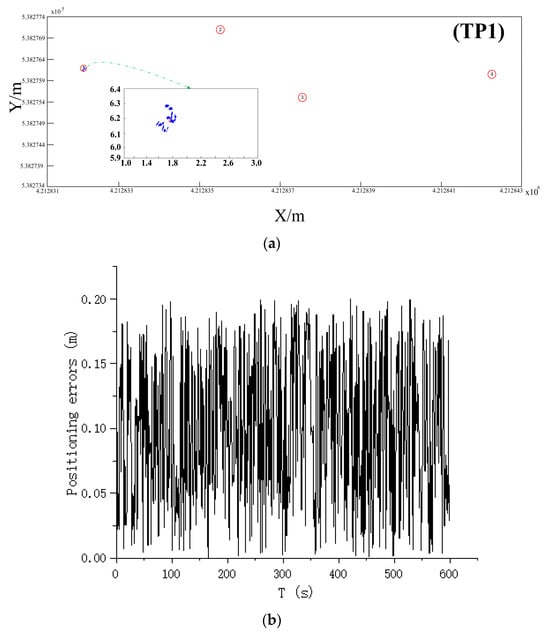 Real-time static positioning results and positioning errors of test point 1. (a) Real-time static positioning results of test point 1. (b) Positioning error of test point 1.