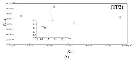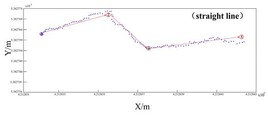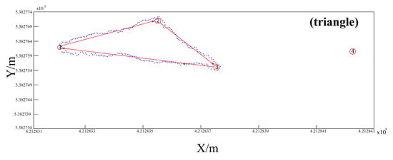 Figure 13 and Figure 14 show the results of the dynamic positioning test. The red circles represent test points 1-4 calibrated with high precision, while the blue dots indicate the real-time positioning results. The red lines represent the predefined test routes, which include a triangular test route consisting of test points 1-2-3-1 and a linear test route consisting of test points 1-2-3-4. In the dynamic positioning error analysis, high-precision calibrated test points along the motion trajectory were selected as reference points to assess the positioning accuracy of the real-time dynamic positioning results. The evaluation results are shown in Table 2.