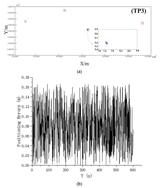 Real-time static positioning results and positioning errors of test point 3. (a) Real-time static positioning results of test point 3. (b) Positioning error of test point 3.