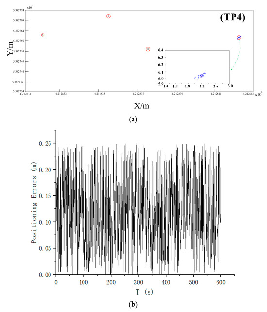 Real-time static positioning results and positioning errors of test point 4. (a) Real-time static positioning results of test point 4. (b) Positioning error of test point 4.