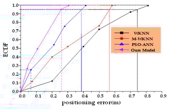 In order to evaluate the localization performance of various algorithms in the created pseudo-satellite C/N0 fingerprint library, the algorithms in this study were compared to the PSO-ANN [29] and M-WKNN [30] algorithms from the existing literature, as well as the traditional WKNN (K = 6). Figure 15 illustrates the comparison of the cumulative probability distribution of the localization accuracy of these four algorithms.