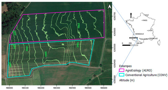 The study site is located in France, in the Occitanie region, more precisely in the Gers department at Estampes (Lambert-93: 480,072.12 m/6,260,508.54 m). This site is one of 17 experimental sites studied in the frame of the Bag’Ages project. It is part of CESBIO Regional Spatial Observatory for long-term in situ monitoring, which began in 2017. This experimental site consists of two contiguous agricultural plots located on clay-limestone slopes identified as Luvisol redoxisol by the French Soil Classification (AFES [36]), and locally called “Boulbènes”. During the year 2019, the twin plots were cultivated with maize. The northern plot (AGRO) (Figure 1) has been cultivated under conservation agricultural methods for the past twenty years. Practices include no-till, cover cropping, and the use of crop residues on the soil surface in between two main crops. The southern plot (CONV) was farmed according to conventional agriculture, with deep ploughing and bare soil during the intercropping periods.