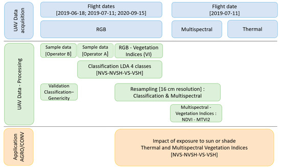 The combined multi-sensor approach embedded in UAVs using high-resolution imagery to monitor agricultural cover has therefore grown over recent years in response to a range of issues. This also benefits from the potential of machine learning applied at decametric-scale resolution [19]. An application for monitoring the behavior of plant canopies raises a challenge in the context of climate change, which is impacting the microclimatic conditions of agricultural canopies particularly. Indeed, the decametric-scale spatial resolution provided by UAV-based remote sensing offers the potential to identify and separate very fine landscape features. This, therefore, represents a significant challenge for fine-tuning the evaluation of the response of canopies to hazards.