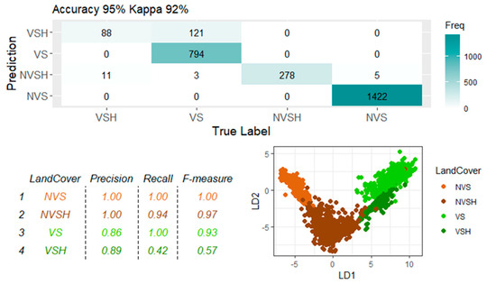 Figure 6 illustrates how each class of land cover could be distinguished by its own reflectance behavior, although some overlap occurred, particularly between VS and VSH on the first two linear discriminants. Furthermore, a hundred and twenty one VSH pixels of VSH were classified as VS (p = 0.89, F-measure = 0.57). This was related to the creation itself of the samples used and to the difficulty in visual detection of the shadows of the leaves, especially when the latter were about 3 cm wide. Vegetation observed in the shade at the nadir only represented 10% of the total surface area, in comparison with 61% of sunlit vegetation (Figure 4). The vegetation (V) and non-vegetation (NV) classes remained very distinct, with only eleven VSH pixels that were incorrectly classified as NVSH. The non-vegetated surface, whether in the sun or shade, was very well detected, with F-measures of 0.99 and 0.97 for NVS and NVSH, respectively.