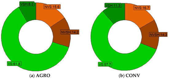 Percentage distribution in 4 classes for each plot: NV, NVSH, VS, VSH, (a) AGRO plot, (b) CONV plot.