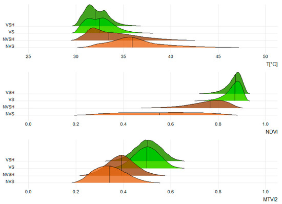 For the V classes, according to the sunlight, the global difference in temperature was negligible (~0.4 °C) and virtually non-existent for the NDVI and MTVI2 vegetation indices (~0.04). However, the differences were significant for the NV classes (Figure 8). Non-vegetated areas (Figure 8) represented the less representative classes, with only 14.8% (2.45 ha) for NVS and 14.5% (2.40 ha) for NVSH. The mask separated these two latter classes according to both the temperature and vegetation index distributions. The median soil temperature in the sun (NVS) was 2.4 °C higher than in the shade (NVSH). The two vegetation indices differed by 26.6% (in relative percentage) for NDVI (median) and by 12.2% for MTVI2 (Figure 8) between NVS and NVSH. This result is discussed in further detail below. Concerning the vegetation, differences were negligible (<1%) independently of the vegetation index, as was expected.