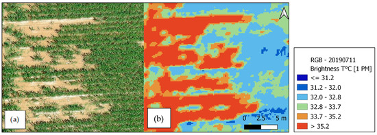 The thermal images, in brightness temperature, contributed to the assessment of the impact of sunshine on the soil and vegetation. The reflectance MS images were used to calculate the NDVI and MTVI2 indices (Table 2).