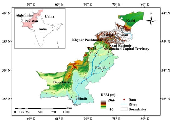 The CPEC spans nine regions, with eight of them situated in Pakistan. Kashi is located in China, ranging from 39.8°N to 45.4°N and 123.5°E to 131.3°E (Figure 1). Pakistan boasts a diverse and intricate topography, extending from the renowned Himalayas and Karakoram mountains in the north and northwest to the flat agricultural plains of the Indus River Basin in the center, and further to the coastal areas along the Arabian Sea in the south [29]. Located in the moist region are Pakistan’s waterways, such as the Indus River and its affluents, which include Kabul, Hunza, Panjkora, Gilgit, Chitral, Jhelum, and Kurram. Many significant dams, including the largest ones such as Tarbela and Mangla, are located in these humid regions. The arid region, primarily located in the Punjab province, serves as the agricultural hub of Pakistan. In the hyper-arid region, Sindh and portions of Balochistan are included, characterized by deserts, plateaus, barren lands, arid mountains, and coastal areas along the Arabian Sea. In Sindh, agriculture is concentrated along the Indus River. Precipitation and temperature exhibit notable spatial variations, aligning with the diverse climate. During the monsoon season, precipitation is concentrated, with the northern region experiencing an annual average temperature below 0 °C, while the central and southern parts of the country see temperatures exceeding 35 °C [30].