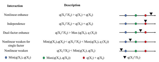- Interaction detector: Utilizing an interaction sensor enabled the identification of interactions between disparate variables (e.g., X1 and X2). Specifically, it assessed if the combined impact of X1 and X2 would enhance or diminish the predictive capability of the attribute Y, or if the effects of these variables on Y were unrelated. The relationship between the two factors (q(X1∩X2)) can be categorized as shown in Figure 2.Figure 2. The interaction type between two independent variables. (Min(q(X1), q(X2) means to find the minimum value between q(X1) and q(X2); Max(q(X1), q(X2)) means to find the maximum value between q(X1) and q(X2); q(X1∩X2) means q(X1), q(X2) is interactive; q(X1) + q(X2) is used to calculate the sum of q(X1) and q(X2)). In our study, SWA and TWS were classified as attributes, whereas the cropland area, the surface area of the dam, annual evaporation, population density, annual precipitation, and the annual average temperature were identified as factors.